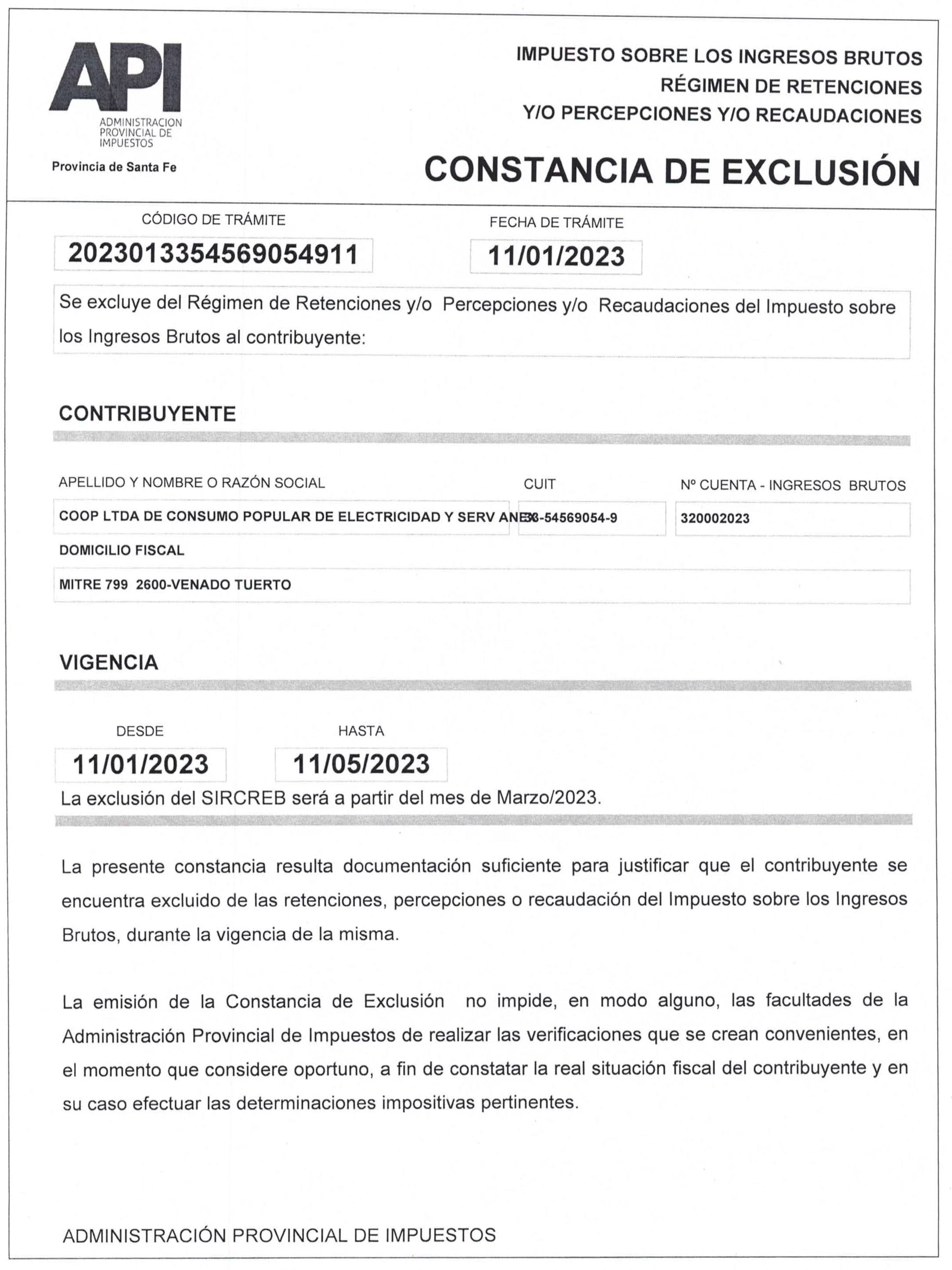 Informamos a ud. que la API ha otorgado a la CEVT una constancia de exclusión en el impuesto sobre los Ingresos Brutos-Régimen de Retenciones y/o Percepciones y/o Recaudaciones desde el 11/01/2023 hasta el 11/05/2023.